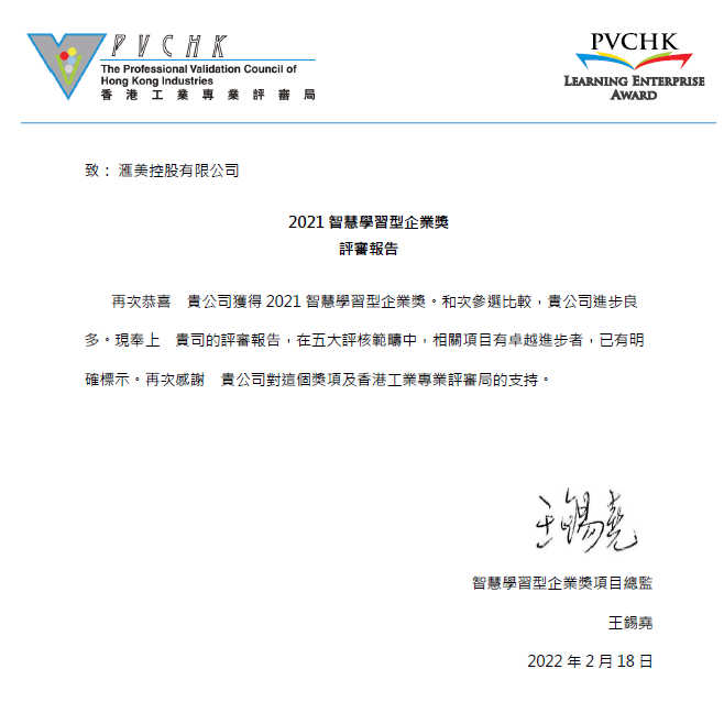由香港工業專業評審局舉辦的“2021智慧學習型企業獎”的獲獎結果已經出爐,今年共有34家企業成功通過復審,最終摘得“2021智慧學習型企業獎”的桂冠。其中,我公司匯美控股就在此獲獎名單中,而且這也是匯美控股連續兩次獲此殊榮了。